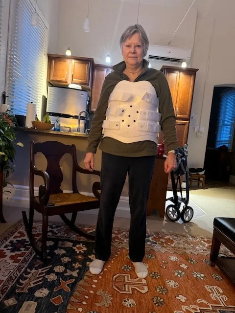This brace! I have to wear it every moment I’m upright. I stay fearful that I’ll twist or bend too far, breaking the rules. How long, I’m not sure. Six weeks at least.
