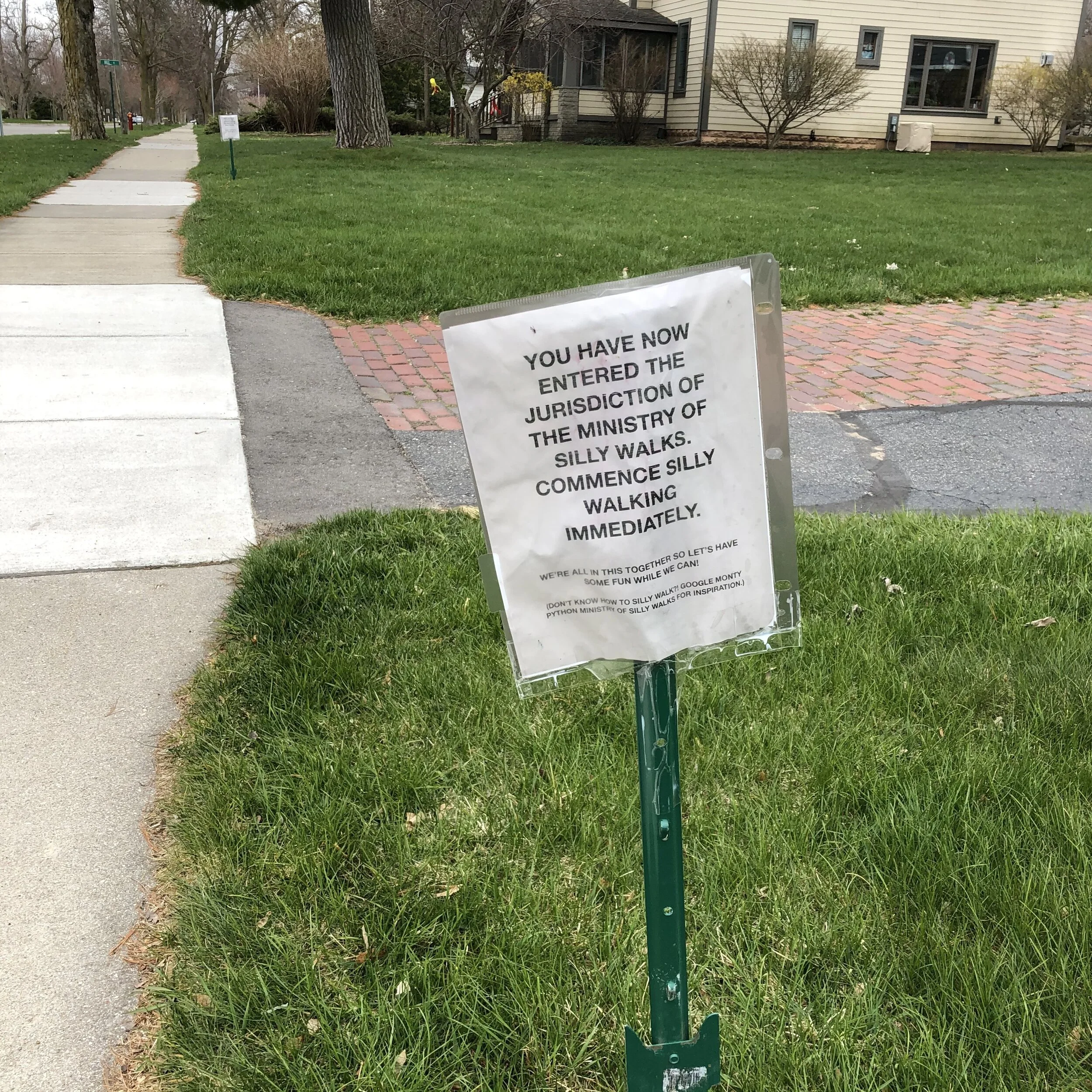 The other sign in the distance says, “You are now leaving the jurisdiction of the ministry of silly walks. Enjoy the rest of your walk. “