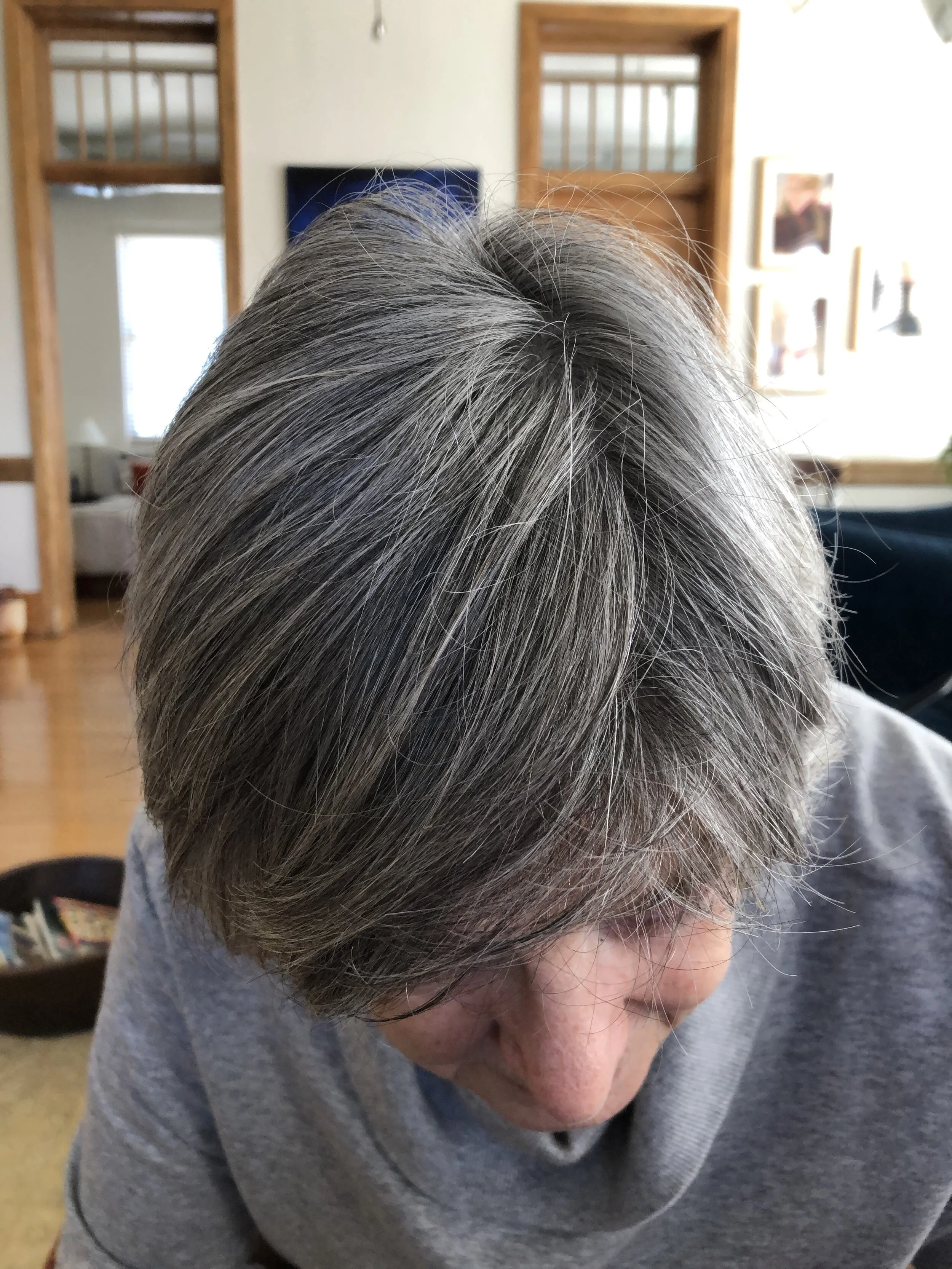 I’m pretty good at cutting hair, but now the back’s too long and I can’t see it well enough to figure how much to cut. The careful sculpture has slowly collapsed into a weighty bubble that no mousse, hairspray, or Wind-tossed-texture-finishing-spray can lift.