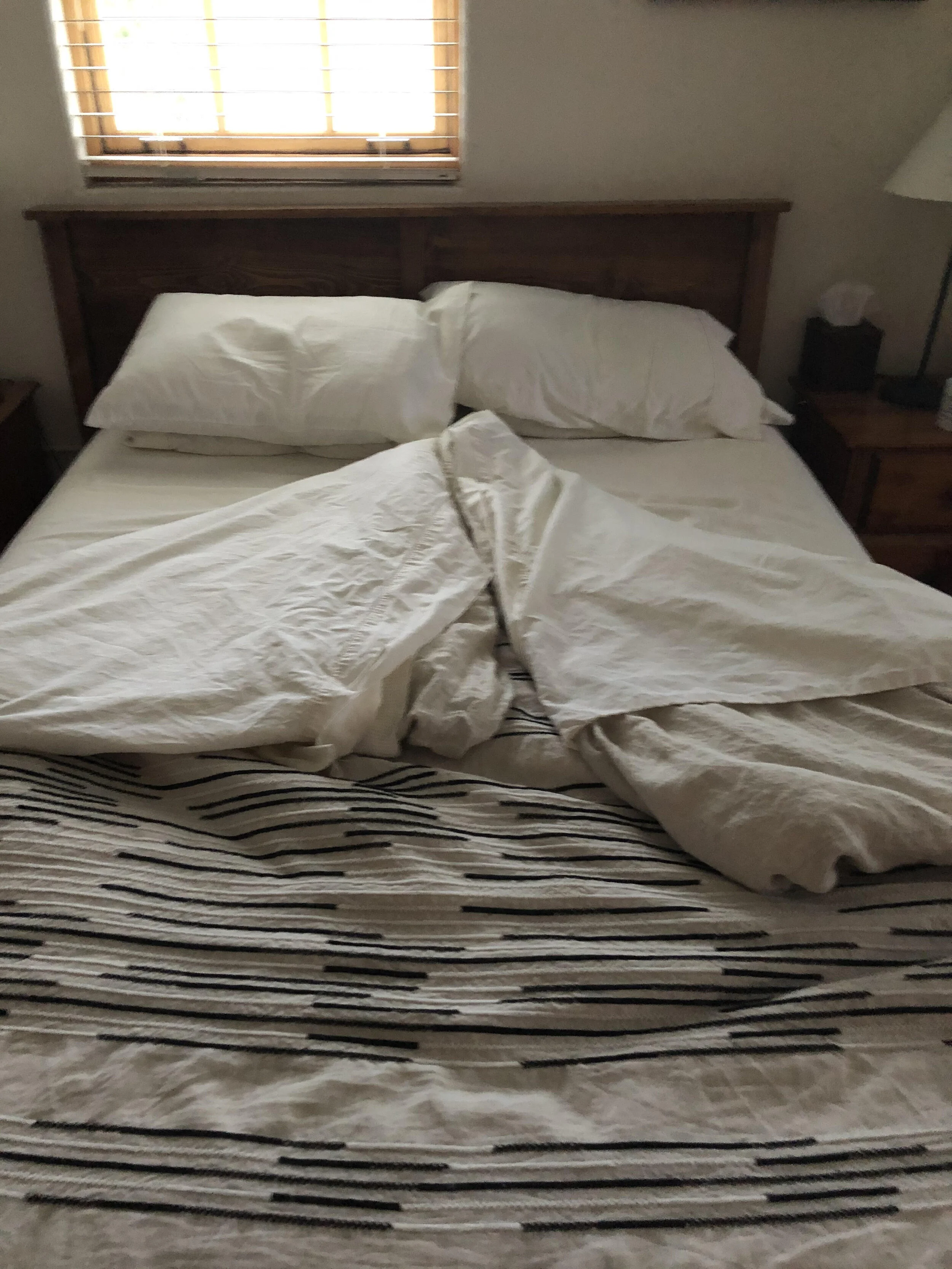 What else do I do all day? I am fascinated that every morning each of us throws the covers off from our side to make a perfect arrow. I am fascinated by the colored lights on the balcony across the way, that send streaming colors down like little waterfalls. I am fascinated by my newfound ability to just sit, not lost in space, actually present, but as if I’m switched to idle.