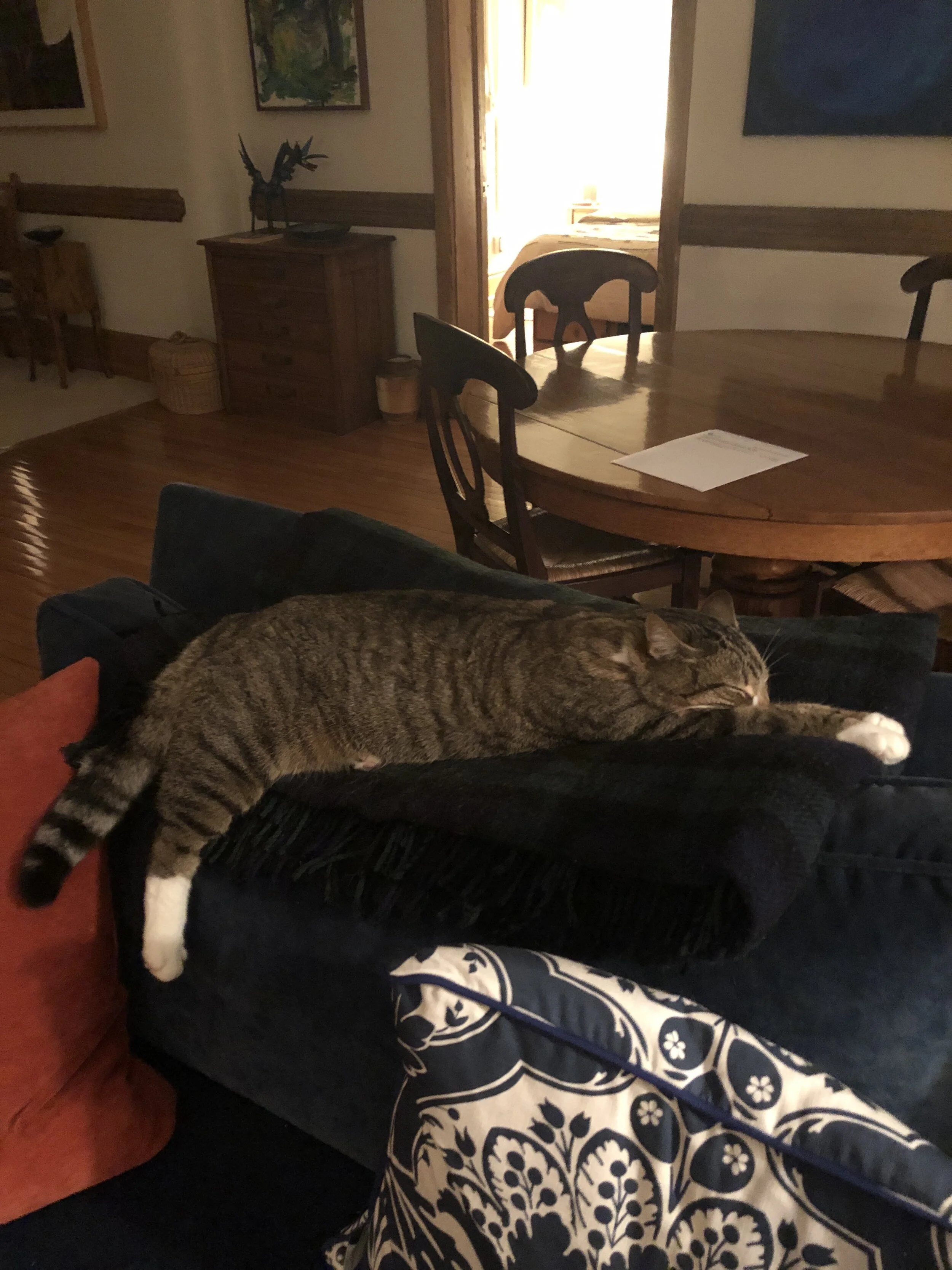 She’s not interested in playing. She’s a little bit afraid of toys. We got a laser-light, thinking it’s less threatening, but even that, she just casually bats at once in a while. My daughter Kelly, who’s a therapist in DC, is co-planning a conference on the issue of play. Why do some people not play? What are the necessary conditions for play? Generally, people who’ve been traumatized aren’t interested in playing. They want to hold fast to the earth they know, not engage in levity. Levity is scary. You don’t know when you leave the ground, when you release normal expectations, when you find words with double meanings, or shifting meanings, what might happen next.