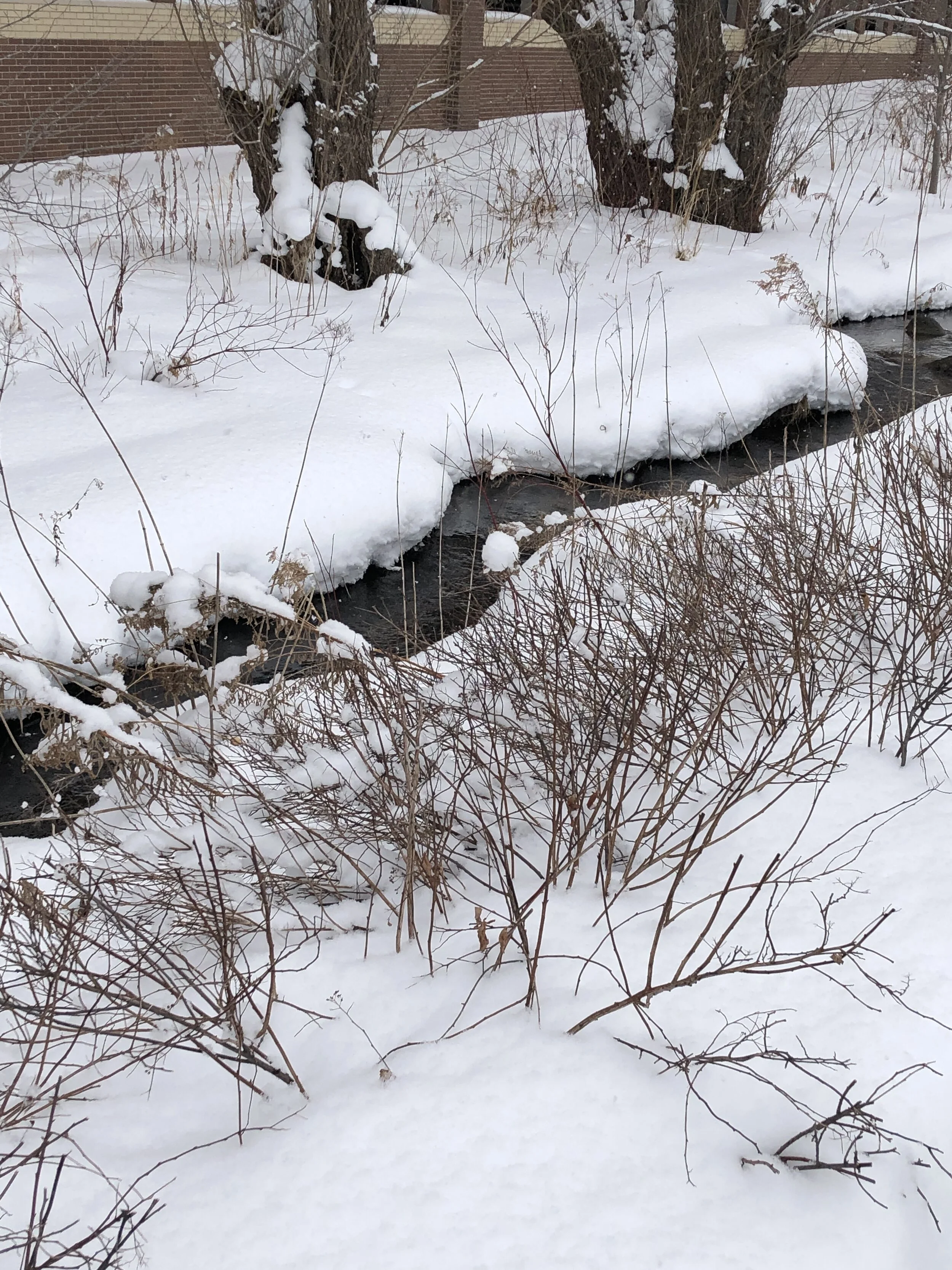 Sometimes I like to walk toward the Bay. Along the edge of the hospital, there’s Kid’s Creek, that’s recently been “upgraded,” making it more winding and lining its edges with native plants to make the water clearer. I love the way snow hangs over the edge like marshmallow creme. The creek seems like a secret, slipping under.