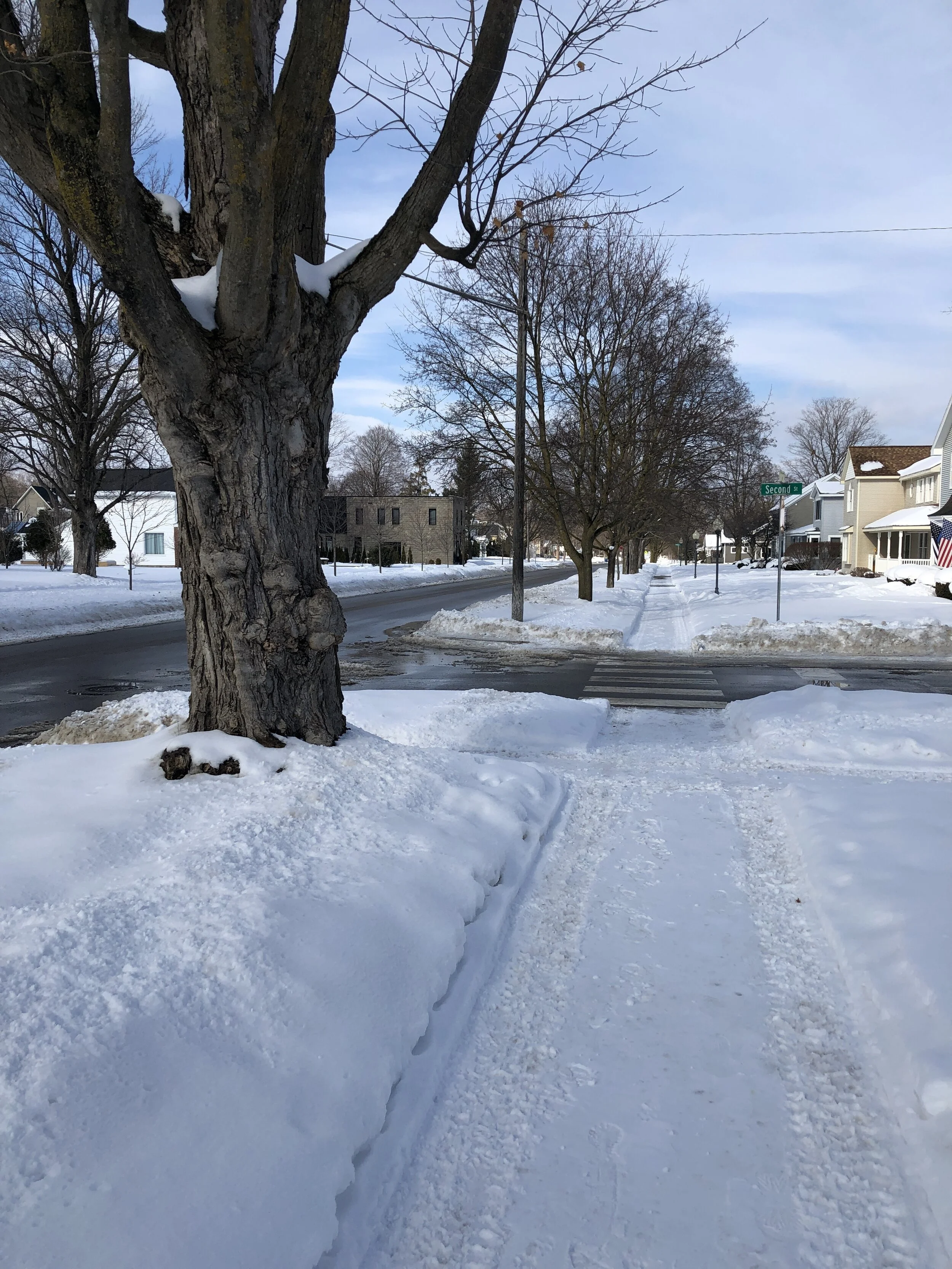 As soon as it snows, the sidewalk plows are out in the main part of town. I’m glad for them, because plowed snow makes walking a lot easier on my back. I love the shadows of trees, moving across as I walk. I think you need to have a quiet mind to see what moves. Not quiet as in passive, or empty. Quiet as in holding still enough to see the movement of things.