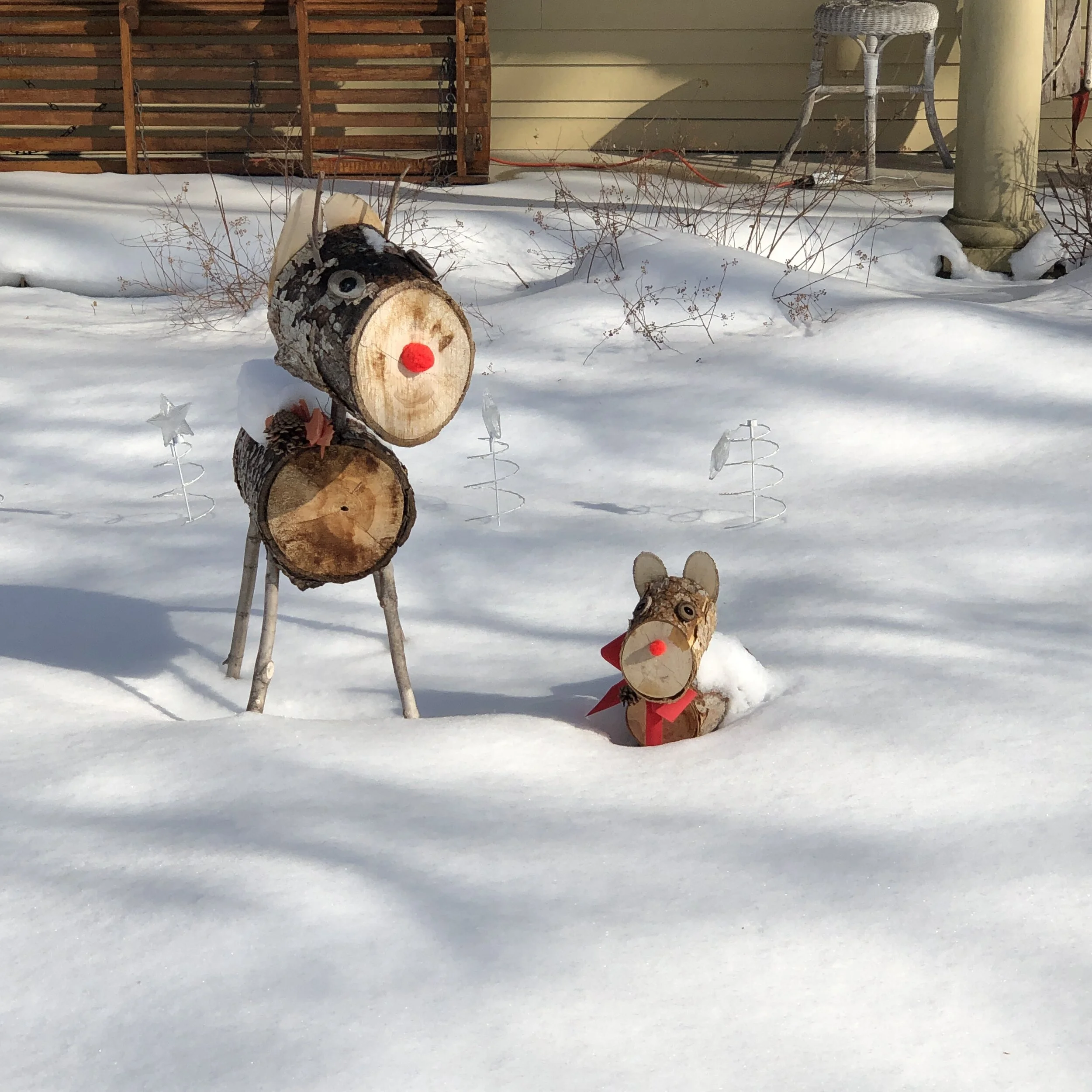 Back to the snow, which is nothing but a big heap of fractals, each shape building on the next. More multiples. And then someone comes along and makes a funny little deer out of logs, and a little dog, I guess it is.