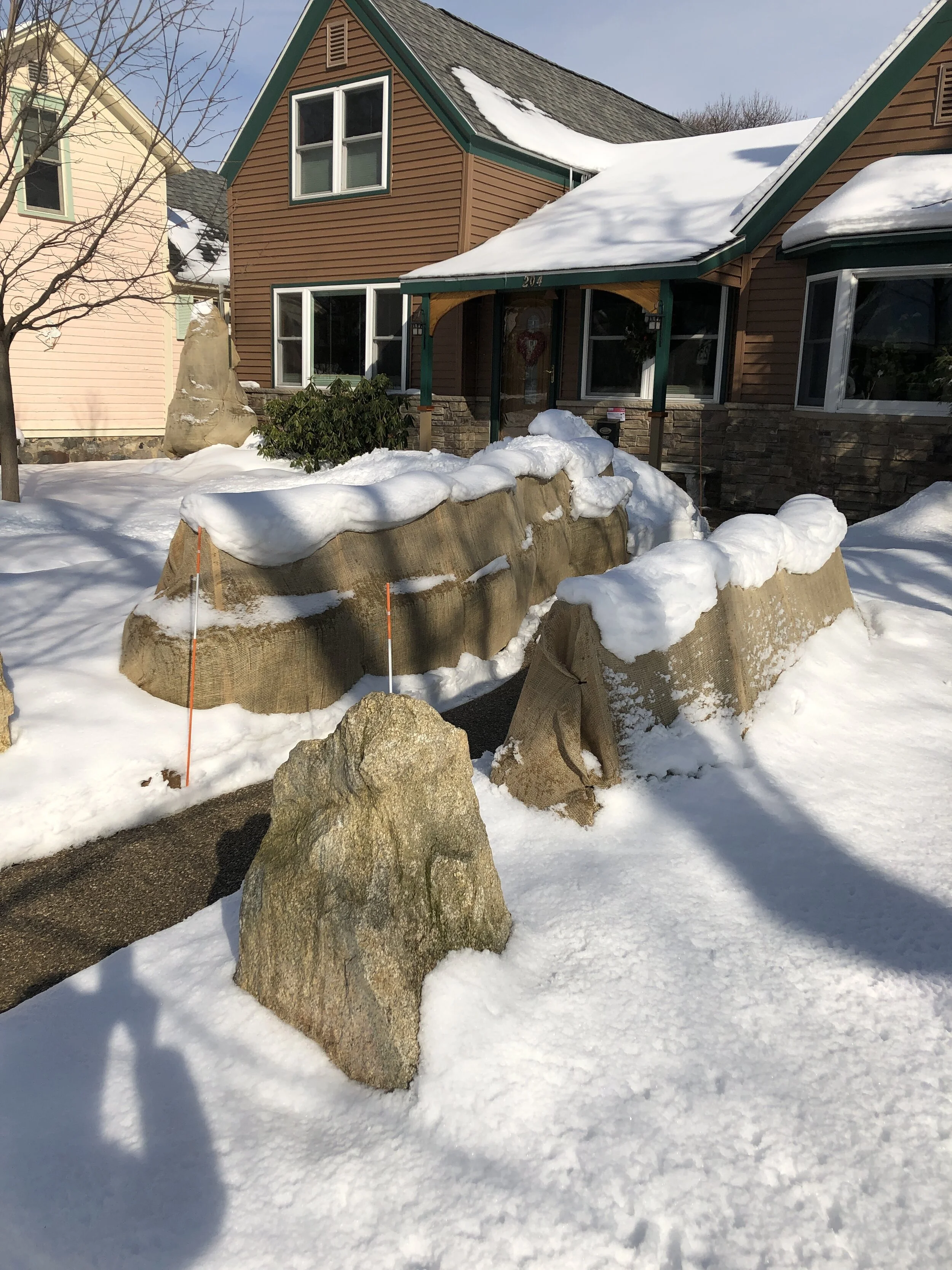 Then here is this yard with all the bushes carefully covered for the winter. They look just like the upright rocks. With the orange sticks, the whole thing is a sculpture, a little Stonehenge.